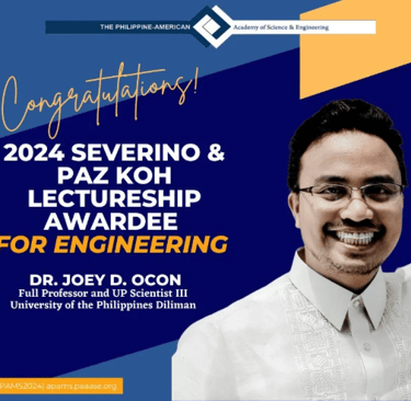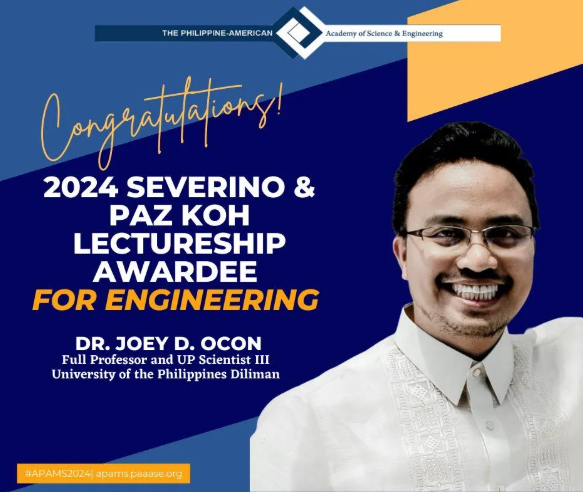 The Philippine-American Academy of Science and Engineering (PAASE) proudly announces Prof. Joey D. Ocon, Professor at the University of the Philippines Diliman, as the recipient of the 2024 Severino and Paz Koh Lectureship Award in Engineering. This prestigious award, presented annually, honors PAASE co-founder Dr. Severino Koh and his wife Paz for their unwavering commitment and support.