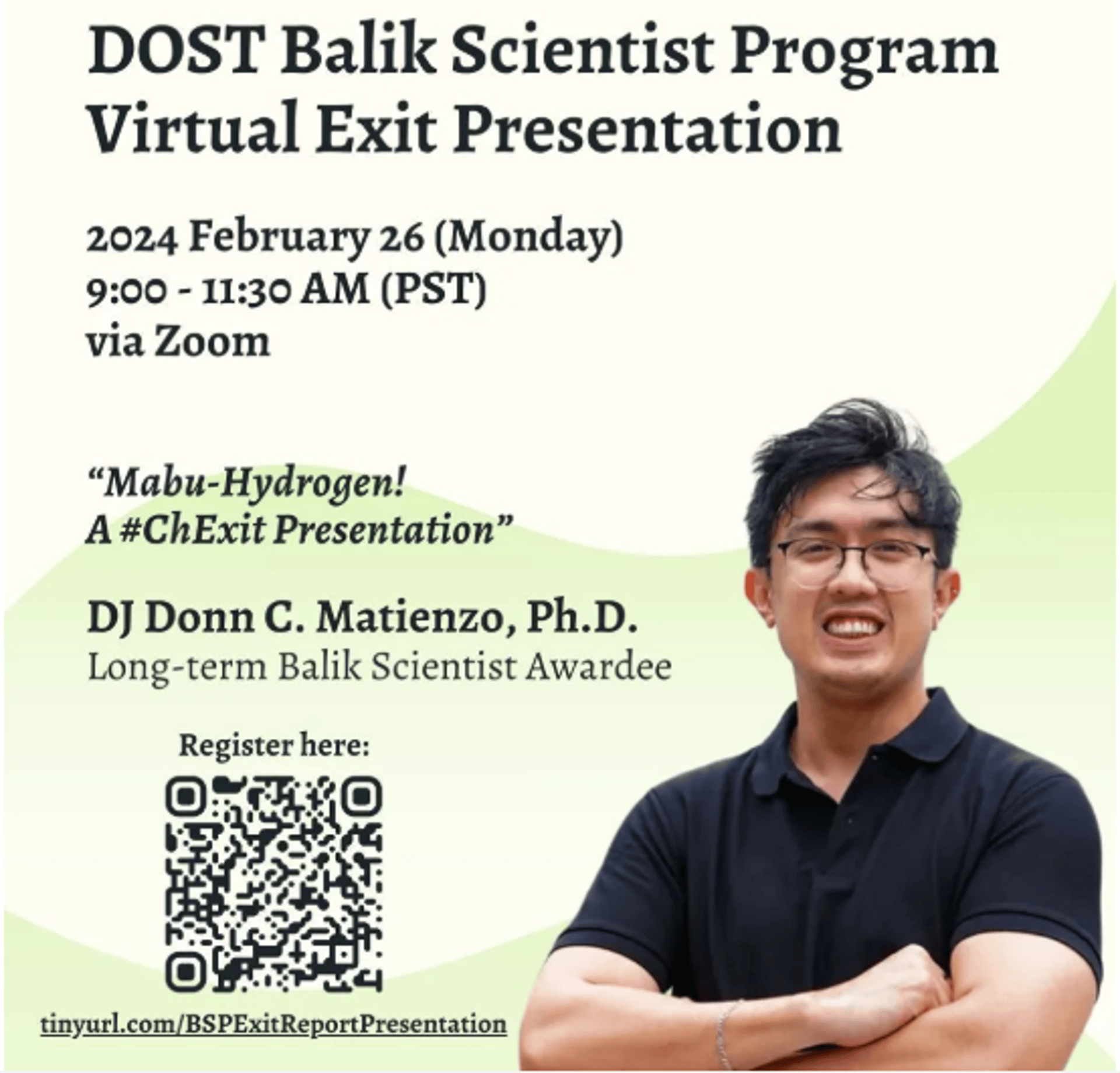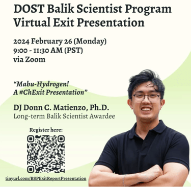 Dr. DJ Donn C. Matienzo, a Research Fellow V of the Project CIPHER and DOST Long-term Balik Scientist Awardee, shared valuable insights through his talk “Mabu-Hydrogen! A #ChExit Presentation” during the DOST Balik Scientist Program Virtual Exit Report Presentation via Zoom last February 26, 2024. Participation to the event was open to the public especially to those who aspire becoming a Balik Scientist Awardee.