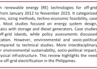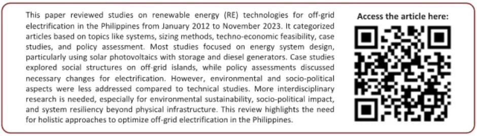 The article discusses challenges in electrifying remote off-grid areas, like those in the Philippines, where many regions have limited electricity access due to reliance on diesel power plants (DPPs). Hybrid renewable energy systems (HRESs) are proposed as alternatives but face gaps in holistic study. A review of articles from 2012 to 2023 reveals a saturation of technical and economic studies on off-grid electrification, while environmental and socio-political factors are less explored. The study emphasizes the need for more comprehensive approaches integrating these factors for effective off-grid electrification in the Philippines, highlighting a gap that future research should address.