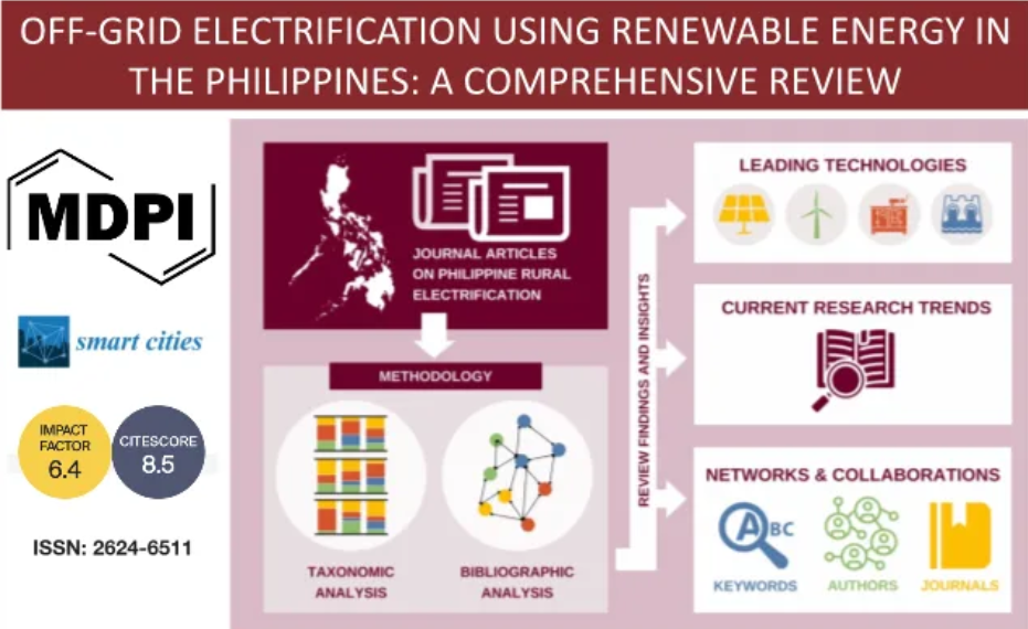 The ElectriPHI Program has recently published a review titled “Off-Grid Electrification Using Renewable Energy in the Philippines: A Comprehensive Review”. The publication was a collaboration among the science research specialists – Engr. Arizeo Salac, Mr. Jairus Dameanne Somera, and project staff - Asst. Prof. Michael Castro, Dr. Maricor Divinagracia-Luzadas, Prof. Louis Angelo Danao, and Prof. Joey Ocon. The review article was published in MPDI’s Smart Cities Journal on April 26, 2024.