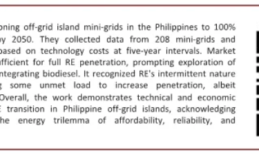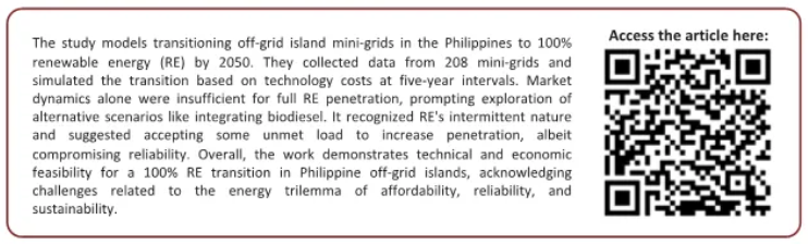 The article examines transitioning Philippine off-grid island mini-grids to 100% renewable energy (RE) by 2050, facing challenges due to high initial costs of RE technologies. The authors propose a gradual RE adoption to manage costs, leveraging expected technology cost reductions. They model the shift using data from 208 mini-grids, advocating gradual adoption to minimize economic impacts. Market dynamics alone may not achieve 100% RE penetration; alternative scenarios like biodiesel integration or accepting some unmet load are explored. Challenges include intermittent RE technology and the affordability-reliability-sustainability tradeoff. Despite hurdles, a 100% RE transition is deemed feasible, emphasizing strategic planning for sustainable, reliable energy systems.