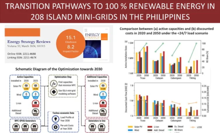 The ElectriPHI Program has recently published an article titled “Transition pathways to 100 % renewable energy in 208 island mini-grids in the Philippines”. The publication was a collaboration among the project staff - Asst. Prof. Michael Castro, Prof. Joey Ocon and a collaborator from the Hong Kong University of Science and Technology Academy Dr. Laurence L. Delina. The article was published in Elsevier’s Journal of Energy Strategy Reviews on February 2, 2024.