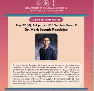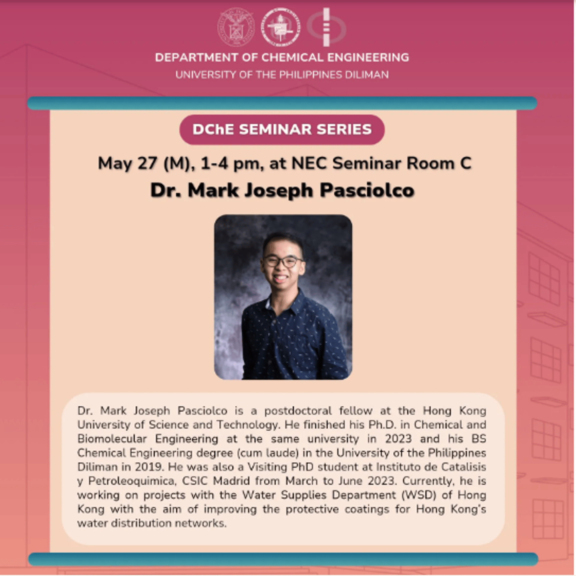 LEE alumni Dr. Mark Joseph Pasciolco shared his academic journey abroad at the DChE Seminar Series last May 27, 2024. Dr. Pasciolco is a cum laude graduate of BS Chemical Engineering in the University of the Philippines Diliman, and also a PhD graduate in Chemical and Biomolecular Engineering at the Hong Kong University of Science and Technology, where he now serves as a postdoctoral fellow.