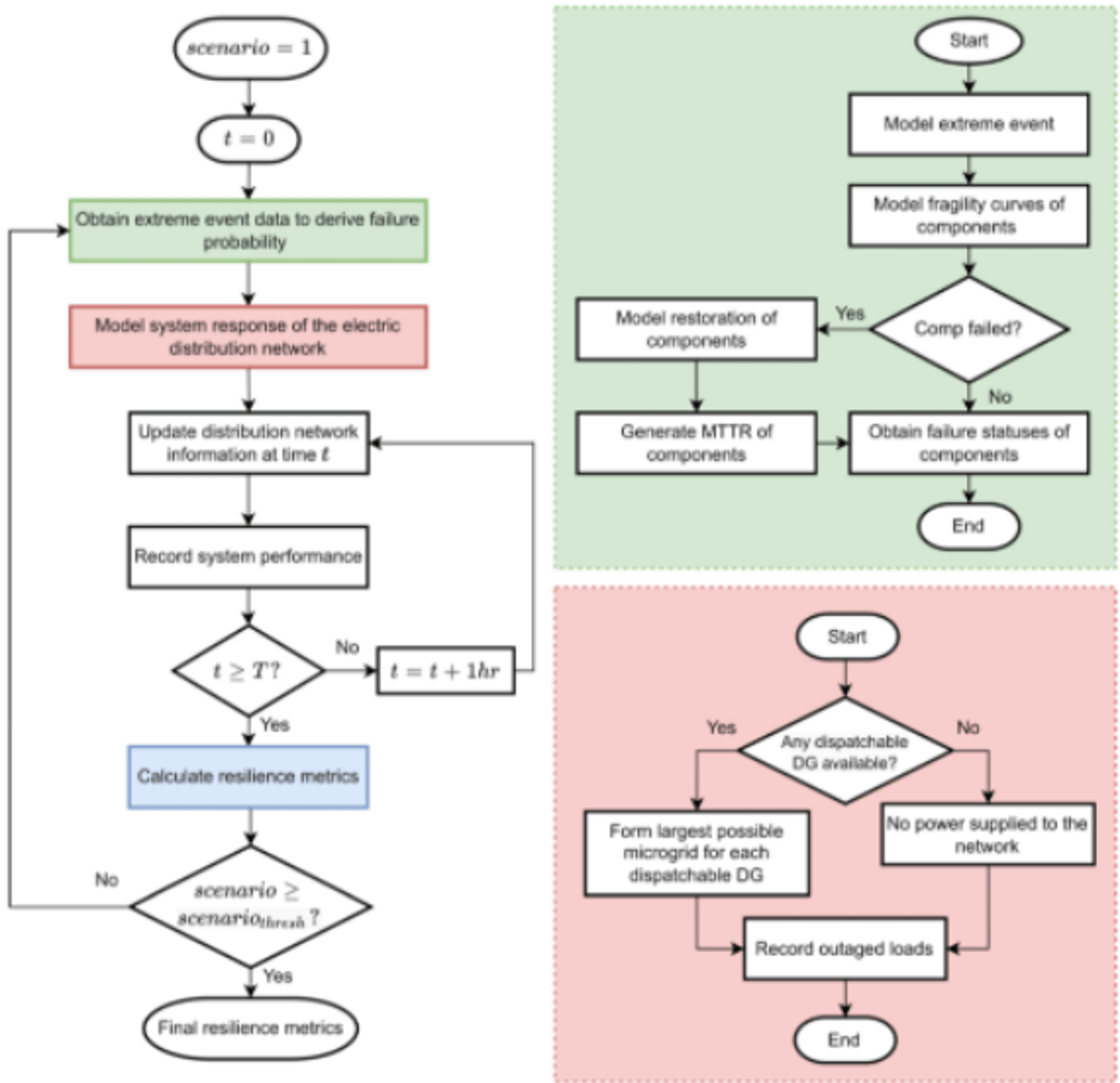 Keywords: Power distribution system resilience, resilience metrics, reliability metrics, Monte Carlo resilience assessment, microgrid operation