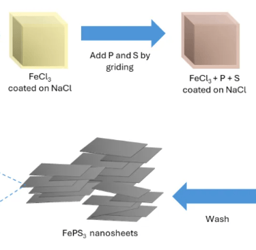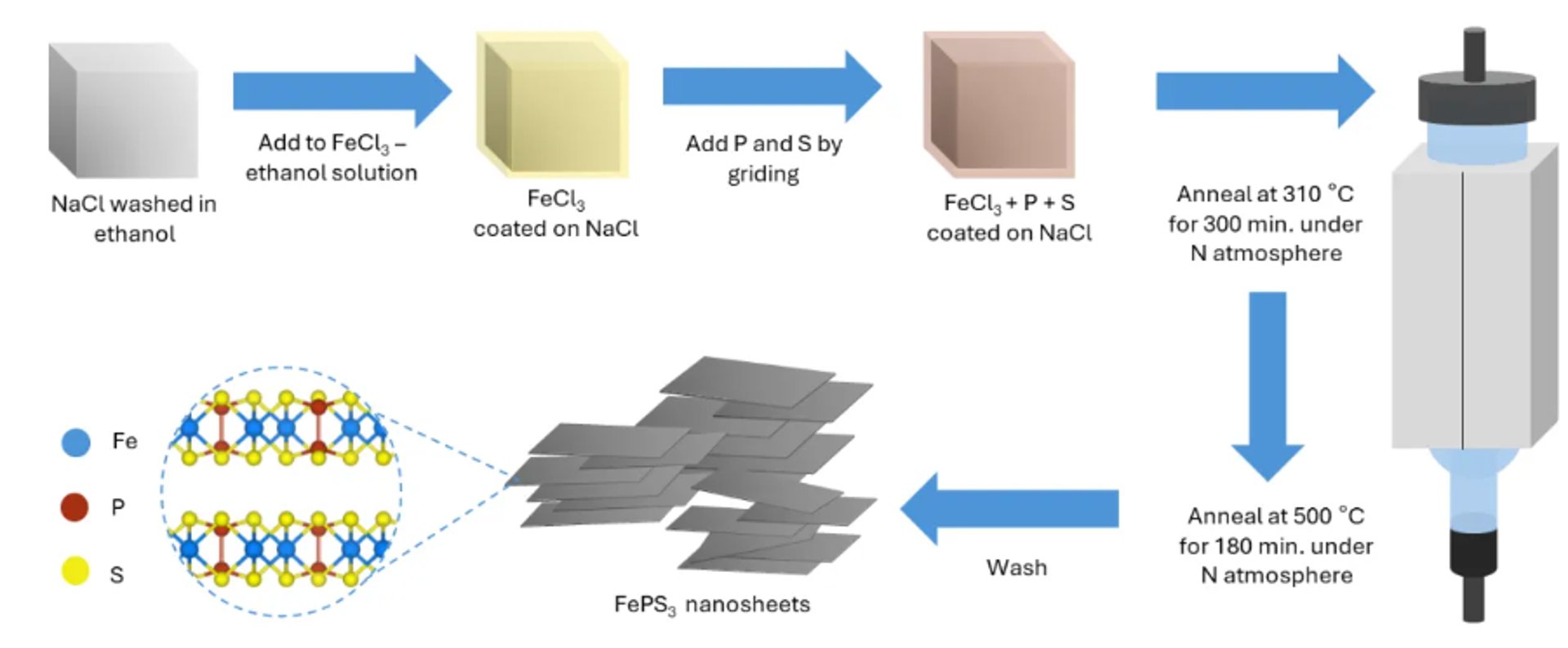 The research article investigates FePS₃ as an electrocatalyst material to improve electrochemical nitrogen reduction reaction (eNRR). Overcoming the high activation barrier of eNRR presents a more sustainable alternative to the conventional NH₃ production process. Nanosized 2D layered transition metal phosphorus-sulfide materials, such FePS₃, have been the focus of research as a high-performing and low-cost material. FePS₃ is synthesized using a simple NaCl template method. Overcoming the high activation barrier of eNRR presents a more sustainable alternative to the conventional ammonia production process. Results show the optimal potential value at −0.6 V vs. RHE, corresponding to a NH₃ yield rate of 164.4 µg h −1 mgcat −1 with a high Faradaic Efficiency of 47%. This demonstrates that Fe-based catalysts are sustainable and cost-effective electrocatalysts for eNRR.