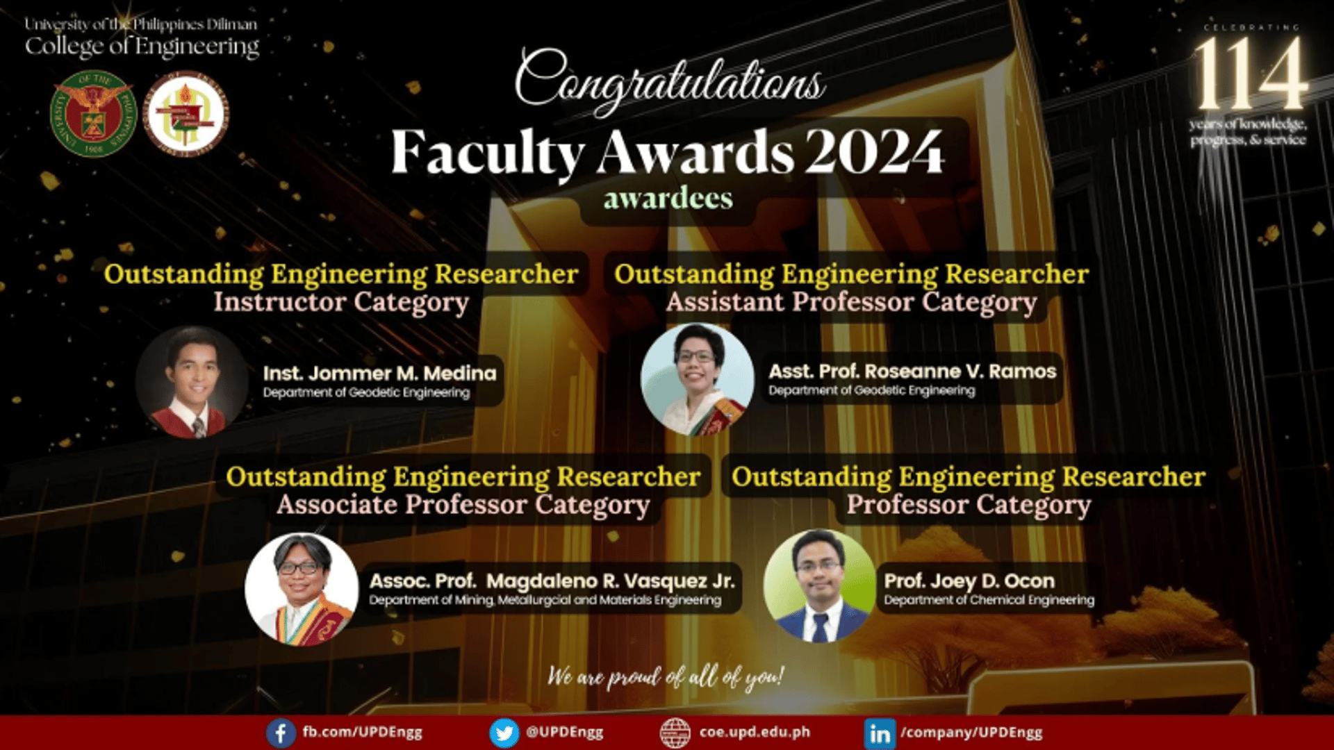 Professor Joey D. Ocon received the esteemed Outstanding Engineering Researcher – Professor Category award at this year's UP College of Engineering Faculty Awards, in recognition of his remarkable contributions to the field of chemical engineering. This marks his third time being honored with this distinction.